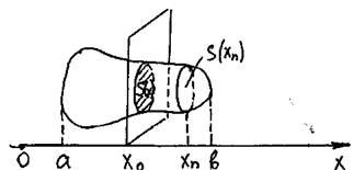 введем вспомогательную функцию S(x) задающую следующее соответствие: каждому x из отрезка [a;b] поставим в соответствие площадь сечения данной фигуры плоскостью, проходящей через заданную точку x перпендикулярно оси ОХ.