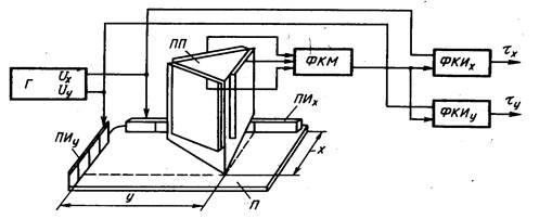 Функцию звукопровода здесь выполняет стеклянный планшет П, к взаимно перпендикулярным торцам которого приклеены два пьезоэлектрических излучателя ПИх и ПИу. Пьезоэлектрический приемник ПП изготовлен в виде трехгранного стержня с заостренным наконечником, сечение которого является равносторонним треугольником. К каждой грани стержня приклеены идентичные пьезоэлементы. Для возбуждения акустических колебаний в звукопроводе используется генератор периодических прямоугольных импульсов Г, имеющий два независимых выхода Uх и Uу, к которым подключены соответственно излучатели ПИх и ПИу. Схема формирователя координатной метки ФКМ состоит из трех одинаковых усилителей, к выходу которых подключены пьезоэлементы приемника. Выходные напряжения усилителей суммируются, что позволяет сделать сигналы метки не зависимыми от повтора и наклона приемника относительно плоскости планшета. Время прохождения акустических волн от излучателей к приемнику измеряется схемами формирования координатных прямоугольных импульсов ФКИх и ФКИу, содержащими триггеры, устанавливаемые в положение "1" передними фронтами импульсов генератора и сбрасываемые в положение "0" импульсом координатной метки. На выходе схемы управления планшетом использован обычный преобразователь длительности импульса в код. Когда приемник прижат к поверхности планшета, ФКИх и ФКИу генерируют периодические импульсы, длительности которых tх и tу пропорциональны измеряемым координатам. Чтобы не возникла интерференция взаимно перпендикулярных волн, возбуждаемых в планшете, импульсы Uх и Uу сдвинуты на время, достаточное для полного затухания одной волны. В ряде магнитострикционных устройств используются магнитострикционные свойства материала, из которого изготовлено рабочее поле планшета. При возбуждении ультразвуковой волны внутри предварительно намагниченного магнитострикционного материала в месте прохождения фронта волны намагниченность изменяется. Это изменение напряженности магнитного поля улавливается катушкой индуктивности, расположенной в указателе координат, и преобразуется в электрический сигнал, свидетельствующий о том, что фронт ультразвуковой волны находится под катушкой. Определение координат в этих устройствах производится так же, как и в акустических,- путем измерения времени распространения фронта ультразвуковой волны от края планшета до указателя координат. Точностные характеристики рассматриваемых устройств относительно невысоки вследствие сильной зависимости скорости распространения волны от внешних факторов, в частности от температуры, давления, влажности, неизотропности структуры материала звукопровода. Важное место среди устройств ввода занимают устройства, называемые сеточными планшетами, основанные на электрическом принципе. Они делятся на контактные, и в зависимости от того, какая из составляющих электромагнитного поля участвует в формировании измерительного сигнала, эти устройства делятся на емкостные, в которых преобразуется электрическая составляющая электромагнитного поля, и индукционные, в которых преобразуется магнитная составляющая.