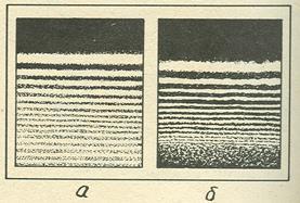 При этом условии дифракционная картина, получаемая от электронного пучка, становится подобной картине дифракции пучка рентгеновских лучей с такой же длиной волны. На рисунке 4 представлены фотографии дифракционных картин, наблюдающихся при прохождении пучка света (а) и пучка электронов (б) у края экрана.
