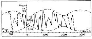 Анализируя характер сближений нашей Земли с кометой, можно обнаружить, что эта функциональная зависимость имеет вид своеобразного колебательного процесса, амплитуда колебаний которого изменяется по типу “биений” (рис. 14). Другими словами, такой колебательный процесс характеризуется наличием так называемых пучностей и впадин, что является следствием подмеченного советским ученым Б. Чириковым хаотического изменения орбиты кометы Галлея.