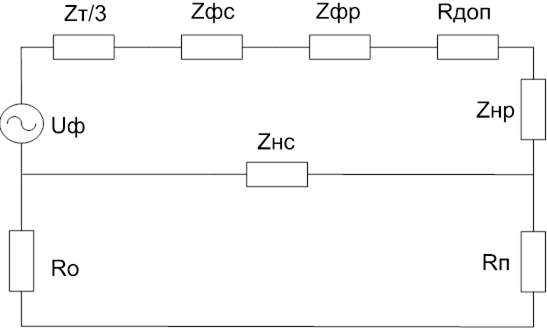 Одним из самых опасных факторов на производстве является электрический ток . Основной целью расчета является определение условий ее надежного функционирования, то есть быстрого отключения поврежденой электроустановки от сети при одновременном обеспечении безопасного напряжения на ее корпусе в течение времени от возникновения аварийной ситуации до момента отключения. Рассчитаем зануление на отключающую способность. Эквивалентная схема для расчета представлена на рис. 5.1.