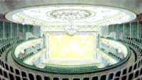 Своей структурой и образом зал филиала задуман, безусловно, как родственник Большого. Это как бы его младший брат, но не близнец и не клонированная копия. С одной стороны, высотные градостроительные ограничения позволили выполнить здесь всего два яруса да полукольцевой бенуар под ними. С другой - сегодня строится не музейный экспонат, а современное сооружение, требующее множества аппаратных, проекционных и других технических помещений, затрудняющих буквальное воспроизведение традиционной системы лож. В данном случае то и другое визуально преодолевается средствами декора. Внешний контур плафона решен с повторением профиля ограждающих барьеров балконов с полукольцом бра, что должно создать впечатление дополнительного яруса и как бы увеличить высоту зала. Ограждающая стена ритмически расчленена пилястрами с декором в промежуточных филенках, напоминающим портьеры лож. Эти изобразительные приемы призваны внести в интерьер элемент игры, намека, легкой ностальгической узнаваемости, что в театре представляется уместным.