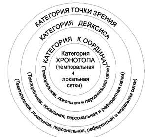 Согласно "принципу матрёшки", центральной, внутренней, исходной категорией является хронотоп, самой крупной, внешней - категория точки зрения. Графически это можно представить следующим образом: