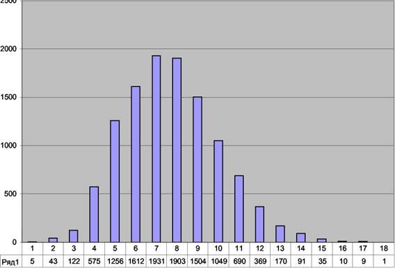 Рис. 1. Соотношение между длиной слова и количеством слов данной длины по данным "Испанско-русского словаря"