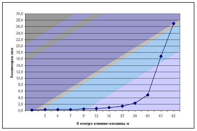 Призабойная зона пласта работает дифференцировано по структуре порового пространства и по зоне дренажа скважины. Для приведенной в примере скважины ¦227 Южно-Пырейного месторождения по данным испытания скважины был определен радиус влияния скважины, он составил 62м. По характеру распределения градиента давления в зоне дренажа этой скважины также было установлено, что на расстоянии свыше 35 м. от стенки скважины будут работать поры > 5мкм, которые в общем объеме пор составляют всего около 3% (рис.3).