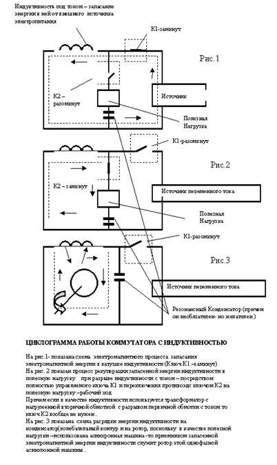 Из ниже приведенных графиков (рис.2) вполне видно, что максимум запасенной энергии в индуктивности соответствует максимуму тока и наступает дважды за период протекания через индуктивность переменного тока. На нижней части графиков показан ток и электромагнитная энергия индуктивности при размыкании (коммутации) тока в первичной обмотке индуктивности ключом К1 . Экспериментами установлено что в момент размыкания тока в индуктивности ее энергия значительно в разы – возрастает вследствие наведенной в ней эдс самоиндукции А что будет- если быстродействующим полупроводниковым ключом рвать цепи фазных токов асинхронной электрической машины (АЭМ )в момент максимальных амплитуд этих токов и запасенную энергию индуктивностей таким образом направлять в виде электрического тока посредством противоэдс на самоэлектропитание фазных индуктивных обмоток для самовращения АЭМ ???