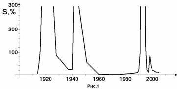 В соответствии с работой [9] для возникновения СДС необходим противоположный дезорганизующий, рассеивающий фактор. Для рассматриваемой социальной системы нет необходимости доказывать наличие этого фактора ни в 1905г., ни в 1917г. Очевидна роль дезорганизующих факторов и в годы реформ. Об усилении дезорганизующих факторов после разрушения ССДС (1991г., 1993г.) в настоящее время имеется много фактов. Следует перечислить основные: разрушение великой страны, деиндустриализация производства, уменьшение объемов производства более чем в два раза, резкое возрастание межнациональных и других конфликтов, частичная потеря возможности осуществления фундаментального принципа развития технологии – принципа специализации, нарушения в воспроизводстве трудовых ресурсов и всего населения и другие острые и кризисные явления, существенно дестабилизирующие систему, что объективно отражает третий пик кривой изменения S на рис.1. Размеры этого пика свидетельствуют о масштабах национальной катастрофы в годы реформ, соразмерной двум предыдущим общенациональным катастрофам 1917г. и 1941г.