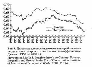 В работе [26] исследованы мировые тенденции в изменении подушевых доходов граждан. Так на рис. 7, процитированном из работы [26], показана динамика дисперсии доходов и потребления по перцентилям мирового населения. (Коэффициенты Джини с 1950г. по 2000г.) Из анализа рис. 7 видно, что мировая тенденция в последние годы направлена на усреднение доходов. Причину первого ниспадающего участка на рис.7 автор [26] объясняет окончанием Второй Мировой Войны. Причину второго ниспадающего участка – ростом экономик развивающихся стран. По времени это также совпадает с перемирием в холодной мировой войне. Интересно заметить, что максимум на рис.7 приблизительно по времени совпадает с максимумом на рис. 4 и минимумом на рис.1 в эти годы.