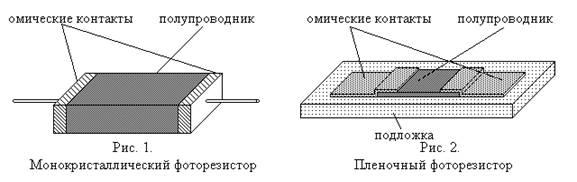 Конструкция монокристаллического и пленочного фоторезисторов показана на рис. 1, 2 приложения. Основным элементом фоторезистора является в первом случае монокристалл, а во втором – тонкая пленка полупроводникового материала.
