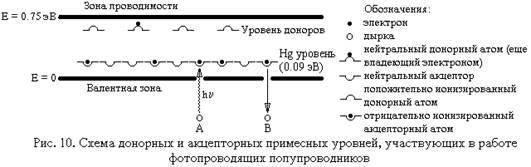 Падающий фотон поглощается и переводит электрон из валентной зоны на уровень атома-акцептора, как это показано на рис. 10 приложения (процесс А). Возникающая при этом дырка движется под действием электрического поля, что приводит к появлению электрического тока. Как только электрон с акцепторного уровня возвращается обратно в валентную зону, уничтожая тем самым дырку (процесс B), ток исчезает. Этот процесс называется электронно-дырочной рекомбинацией