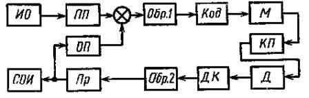На рис. 2 дана функциональная схема прибора, на которой указаны: исследуемый объект ИО;первичный преобразователь П1;устройство сравнения УС; устройство обработки сигналов Об. 1, в котором производится селекция, усиление, коррекция погрешностей, фильтрация и др.; кодирующее устройство Код; модулятор М; канал передачи КП; устройство детектирования Д; устройство декодирования ДК; устройство обработки информации Oбр. 2, обеспечивающее функциональное преобразование, коррекции погрешностей, формирование функции преобразования (1) и др.; преобразователь Пр, выдающий информацию на систему отображения СОИ и на обратный преобразователь 0П, с которого поступают сигналы на устройство сравнения. Эта схема является обобщенной и включает ряд элементов, которые в более простых приборах могут отсутствовать.