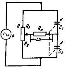 В простейшем случае дифференциальный емкостный датчик представляет собой две последовательно включенные емкости, построенные конструктивно таким образом, что приувеличении одной из них другая уменьшается. Эти две емкости могутбыть включены в мостовую схему(рис. 7), где два других плеча - реостатные. Если при этом напряжение, снимаемое с диагонали моста, использовать в качестве сигнала для следящей системы, перемещающей щетку потенциометра R в сторону уменьшения рассогласования, то всегда в установившемся состоянии следящей системы это напряжение u=0вэтом случае справедливо соотношение