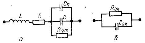 Поскольку емкости преобразователей малы и редко превышают 50-100 пФ, то необходимо учитывать сопротивление утечки изоляции Rуг, паразитную емкость Сп между электродами и заземленными элементами, а также сопротивление Д и индуктивность L проводящих кабелей. На Рис.8 дана эквивалентная схема емкостного преобразователя. Необходимость учета всех указанных факторов возникает на достаточно высоких частотах (обычно свыше 10 МГц). Применяемые в емкостных преобразователях диэлектрики неидеальны, и им свойственныпотери. При идеальныхдиэлектриках сдвиг фазмежду током и напряжением равен П