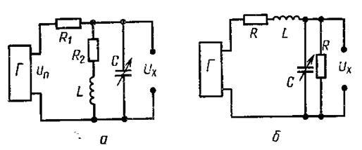 На Рис. 9 приведены измерительные цепи в виде параллельного (а) и последовательного (б) колебательных контуров, питаемых стабильным по амплитуде и частоте напряжением U , снимаемым с генератора Г. При изменении емкости C=C + C напряжение (Рис. 9, а) или ток (Рис. 9, б) в цепи резонансного контура будут меняться, достигая максимума при резонансе =l/ . На склонах, резонансной кривой (Рис. 9, в) мелено выбрать участок, близкий к линейному, в середине которого выбирается рабочая точка М, соответствующая среднему значению емкости C преобразователя. При изменении емкости на напряжение на выходе будет меняться на .