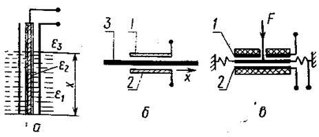 Конструктивныесхемы емкостных преобразователей выполняются различных вариантах в зависимости от области применения (Рис. 11) При измерении уровней жидких и сыпучих тел находят применение цилиндрические или плоские конденсаторы (см. Рис. 11,а), емкость которых характеризуется уровнем х и зависит от диэлектрических проницаемостей жидкости , изоляции и воздуха .