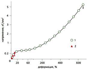 Рис. 1. Зависимость напряжения от деформации монокристаллов цинка при 400°С: