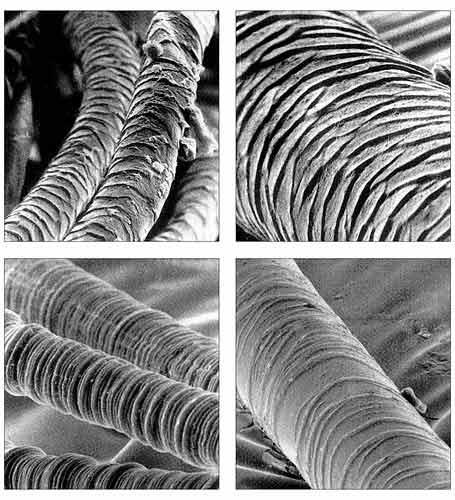 Рис. 9. Микрофотографии природных шерстяных волокон овцы (а), собаки (б),