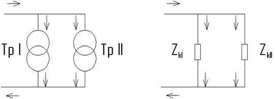 С некоторым приближением, пренебрегая токами холостого хода, можно параллельно включенные трансформаторы заменить их сопротивлениями короткого замыкания ZkI и Zkii [2].