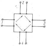 Циркулятором в технике сверхвысоких частот принято называть многополюсник, схематически изображённый на рис 1 и отличающийся следующими важными свойствами. При подаче сигнала в плечо 1 энергия передаётся только в плечо 2 и неответвляется в другие плечи (на рис.1 плечи 3 и 4). Если энергия поступает на вход циркулятора со стороны плеча 2, то она не попадает в плечи 1 и 4, а передаётся в плечо 3. Плечо 3 в свою очередь оказывается связанным только с плечом 4. Последнее плечо (на рис. 1 - плечо 4) обеспечивает связь только с плечом 1.