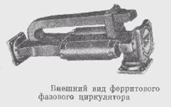 На рис. 4 и 5 схематически изображены два других типа ферритовых циркуляторов. В четырёхплечем устройстве, показанном на рис. 4, используется эффект Фарадея. Ферритовый стержень, находящийся в продольном постоянном магнитном поле, располагается вдоль оси круглого волновода, возбуждаемого на волне типа Н11. К этому волноводу под углами 45град подключаются четыре входа, выполненных на базе стандартных прямоугольных волноводов.   Развязка между соответствующими плечами достигается за счёт поляризационных явлений. Так, при подаче энергии со стороны плеча 4 волна не может поступать в плечо 2 вследствие взаимно перпендикулярного расположения плоскостей поляризации в соответствующих прямоугольных волноводах. Далее, волна не может ответвляться из круглого волновода в плечо 3, так как после прохождения секции с ферритом электрическое поле в круглом волноводе параллельно широкой стенке плеча 3. Единственным возможным направлением движения энергии из плеча 4 является плечо 1, что и требуется от циркулятора.