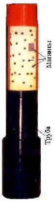 Инжиниринговой компанией "Инкомп-нефть" освоено производство глубинных скважинных установок магнитной обработки жидкости типа УМЖ. Установка УМЖ-73-005 представляет собой корпус (рис. 3) из ферромагнитной трубы с присоединительными резьбами. На одном конце трубы закреплена муфта с присоединительной резьбой. На внутренней поверхности корпуса закреплены точечные постоянные магниты, залитые полимерной композицией.