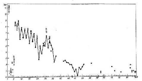 Рис.4 Распространенность химических элементов относительно водорода в атмосфере Солнца По оси ординат - десятичный логарифм относительной (по отношению к водороду) концентрации различных химических элементов. Логарифм концентрации водорода принят равным 12. Различными символами отмечены данные, полученные разными исследователями.