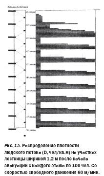 Как было показано при одновременной эвакуации людей со всех этажей высотного здания в его незадымляемых лестничных клетках через несколько минут образуются (рис. 1) на уровне выходов с этажей людские потоки с максимальной плотностью. Такая плотность потока постепенно распространяется на всю лестницу. При этом часть людей долго не может выйти с этажей в лестничную клетку, а на выходе из неё постоянно на протяжении практически всего времени эвакуации поддерживается предельная плотность потока (выше 5, до 9 чел/м2). Естественно, что при таких плотностях скорость движения людей становится минимальной и эвакуация растягивается на часы. Но страшнее другое. Давление людей друг на друга в образовавшейся толпе достигает таких величин, что прогибаются ограждения из стальных труб диаметром 50 мм, сдавливание тела приводит к компрессионной асфиксии. Такие случаи известны не только медикам. Гибель людей в переуплотненной толпе при похоронах И.В. Сталина описана, например, в произведениях П. Проскурина и Е. Евтушенко. Подобное происходит и в наши дни: по заключению медицинской экспертизы 19 молодых женщин погибли в результате компрессионной асфиксии во время известной демонстрации в Тбилиси.