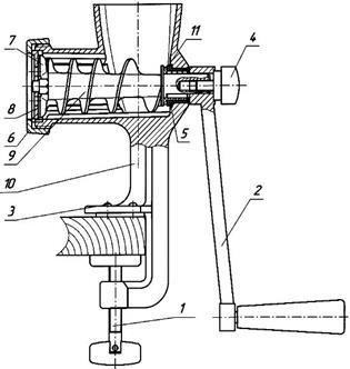 Винт 1, который с помощью опоры 3 крепится к столу; рукоятки 2, закрепленной с помощью винта 4 со шнеком 9; последний вращается в тулке 5 и втулке шнека 11; на конце шнека 9 закреплены нож 7 и решетка 8, которые в свою очередь в месте со шнеком 9 фиксируются нажимной гайкой 6.