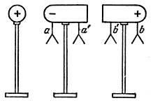 Электризация через влияние. Проводник заряжается не только при контакте с заряженным телом, но и в том случае, когда оно находится на некотором расстоянии. Исследуем подробнее это явление. Подвесим на изолированном проводнике легкие листки бумаги (рис. 3). Если вначале проводник не заряжен, листки будут в неотклоненном положении. Приблизим теперь к проводнику изолированный металлический шар, сильно заряженный, например, при помощи стеклянной палочки. Мы увидим, что листки, подвешенные у концов тела, в точках а и b, отклоняются, хотя заряженное тело и не касается проводника. Проводник зарядился через влияние, отчего и само явление получило название «электризация через влияние» или «электрическая индукция». Заряды, полученные посредством электрической индукции, называют наведенными или индуцированными. Листки, подвешенные у середины тела, в точках а’ и b’, не отклоняются. Значит, индуцированные заряды возникают только на концах тела, а середина его остается нейтральной, или незаряженной. Поднося к листкам, подвешенным в точках а и b, наэлектризованную стеклянную палочку, легко убедиться, что листки в точке b от нее отталкиваются, а листки в точке а притягиваются. Это значит, что на удаленном конце проводника возникает заряд того же знака, что и на шаре, а на близлежащих частях возникают заряды другого знака. Удалив заряженный шар, мы увидим, что листки опустятся. Явление протекает совершенно аналогичным образом, если повторить опыт, зарядив шар отрицательно (например, при помощи сургуча).