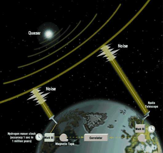 | Рис.4 - Радиоинтерферометрия со сверхдлинной базой. Метод основан на синхронном приеме двумя (или несколькими) антеннами, расположенными на межконтинентальном расстоянии друг от друга, радиосигнала от удаленного радиоисточника. Радиосигнал записывается на магнитные ленты, которые обрабатывают на корреляторе. Коррелятор находит временнyю задержку в приеме радиосигнала на более удаленной от радиоисточника антенне, что позволяет определить направление на него с точностью до 10 мкс дуги. |
