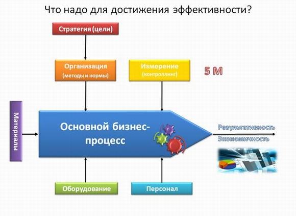 Любое развитие системы – осуществляется через изменения каких-либо факторов определяющих ее состояние. Набор этих 5-ти факторов (все на букву М на английском) виден на слайде: Организация (Methods), Измерения (Measurement), Оборудование (Mechanisms), Персонал (Man), Ресурсами на входе (Materials). Только воздействуя на эти факторы, мы можем управлять его характеристиками результата: качеством, количеством, временем и местом предоставления, уровнем затрат.