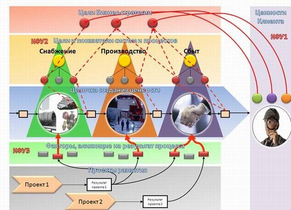 Второй уровень критических факторов успеха – КФУ2 идентифицирует наиболее важные внутренние возможности компании, на которых базируются ее конкурентные преимущества. Цепочку создания ценности образуют функциональные системы (группы процессов в области закупок, производства, и сбыта), имеющие определенное целевое назначение. Для создания успешной бизнес-стратегии недостаточно понимать лучше конкурентов ценности клиента. Надо уметь их ему предоставить, а для этого надо понять результаты каких процессов из цепочки создания ценности являются самыми важными, какими характеристиками они должны обладать и какими показателями должны оцениваться.