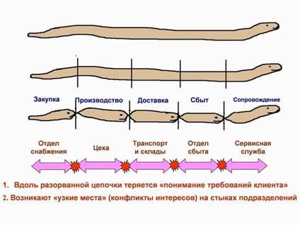 . Наибольший вред компании приносило превращение в такие крепости функциональных подразделений образующих, так называемую, «цепочку поставок»: маркетинг, проектирование, закупки, производство, сбыт. По этой линии происходило и происходит в компании взаимодействие с клиентом. Любая неэффективность такого взаимодействия сразу же отражается на способности компании к созданию конкурентоспособного ценностного предложения. «Переход к разделению труда и массовому производству привел к резкому снижению цены и к такому же падению качества»[8]
