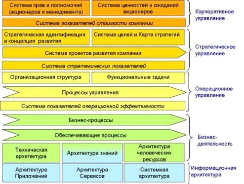 Архитектура системы управления структурируется как по уровням (корпоративный, стратегический, операционный), так и по функциональным областям:
