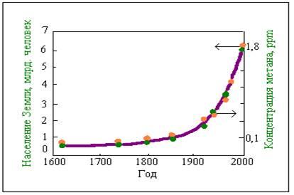 Рис. 2. Изменения содержания метана в атмосфере и населения Земли во времени3