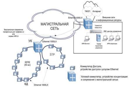 В структуре городской распределенной сети при ее создании должны быть учтены три уровня: уровень доступа, уровень концентрации и уровень сервисов. Уровень доступа включает коммутаторы доступа (КД), которые являются узлами доступа городской операторской сети. КД могут располагаться в жилых домах, в зданиях бизнес-центров, в офисах корпоративных клиентов. Уровень концентрации включает узловые коммутаторы (УК) - концентрирующие узлы городской операторской сети. УК агрегируют трафик КД и передают агрегированные потоки к другим УК сети оператора. При необходимости функциональность КД и УК может быть реализована в одном устройстве. УК может располагаться на территории офиса клиента, на узле связи оператора или в жилом доме.