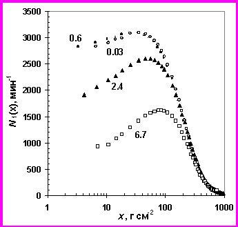 Из высотных зависимостей (см. примеры на рис.1а, б) можно определить потоки заряженных частиц на границе атмосферы, где атмосферное давление х = 0. Для этого находим разность кривых поглощения, полученных на широтах с Rс = 0.6 ГВ и Rс = 2.4 ГВ при 4 < х < 85 г.см–2 и экстраполируем их к границе атмосферы.