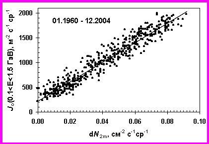 Рис. 4а. Корреляционная связь между среднемесячными значениями первичных потоков космических лучей J0(0.1 > Е > 1.5 ГэВ), полученными методом экстраполяции за период 07.1957–06.2004, и разностями потоков частиц dN1m по данным одиночного счетчика в максимуме высотных кривых в атмосфере на широтах с Rс = 0.6 и 2.4 ГВ. Прямая линия проведена методом наименьших квадратов.