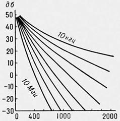 Рис.8. График изменения напряжённости поля с расстоянием r ( в км ). По вертикальной оси отложена величина множителя ослабления, который определяется отношением напряжённости поля в реальных условиях распространения к величине напряжённости поля при распространении в свободном пространстве.