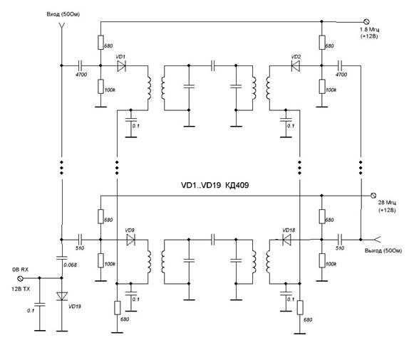 Oн закрыт, и сигнал со входа проходит через один из полосовых фильтров. При передаче напряжением +12 В диод VD19 открывается и тем самым шунтирует вход. В этом случае сигнал в приемный тракт не проходит.
