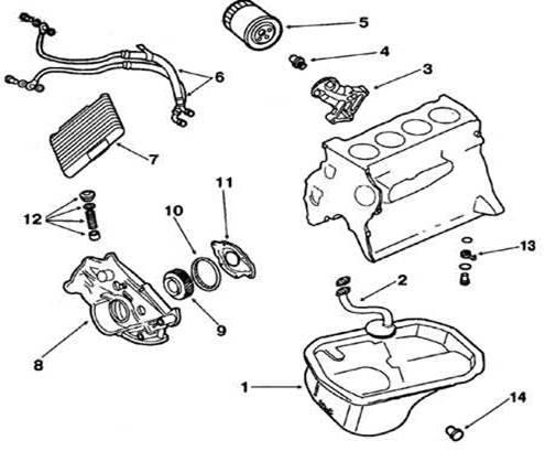 1. Масляный картер; 2. Маслоприемник; 3. Кронштейн масляного фильтра; 4. Перепускной клапан масляного фильтра; 5. Масляный фильтр; 6. Армированные шланг; 7. Масляный радиатор; 8. Нижняя крышка блока цилиндра; 9. Ведущая шестерня масляного насоса; 10. Ведомая шестерня масляного насоса; 11. Крышка масляного насоса; 12. Редукционный клапан; 13. Форсунки для охлаждения днища поршня; 14. Маслосливная пробка