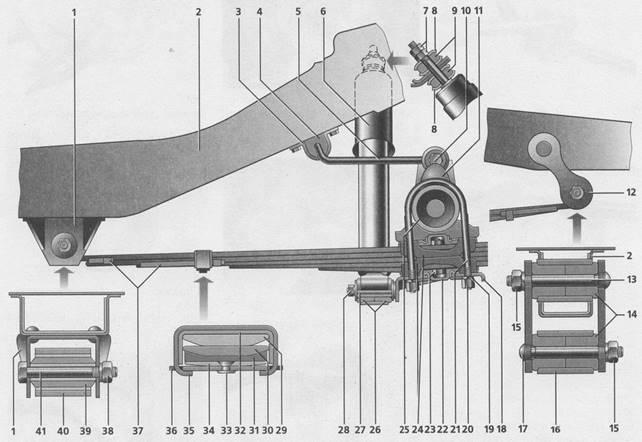 1 — кронштейн заднего лонжерона; 2 — задний лонжерон кузова газ 31105; 3 — скоба; 4 — подушка стабилизатора; 5 — штанга стабилизатора поперечной устойчивости; 6 — амортизатор; 7 — гайка и контргайка верхнего крепления амортизатора; 8 — стальные шайбы подушек; 9 — резиновые подушки; 10 — болт крепления штанги стабилизатора к заднему мосту; 11 — резиновый буфер хода сжатия; 12 — серьга рессоры; 13,17 — палец серьги; 14 — резиновые втулки; 15 — гайка пальца; 16 — задняя проушина коренного листа рессоры; 18 — подкладка рессоры; 19 — пружинная шайба; 20 — гайка стремянки; 21 — стремянка; 22 — резиновая подушка; 23 — центровой болт; 24 — обоймы рессоры; 25 — задний мост; 26 — резиновые втулки; 27 — палец подкладки рессоры; 28 — гайка пальца; 29 — коренной лист рессоры; 30 — подкоренной лист рессоры; 31 — противоскрипная прокладка; 32 — резиновая прокладка хомута; 33 — заклепка; 34 — третий лист рессоры; 35 — хомут; 36 — пластина хомута; 37 — противоскрипные прокладки; 38 — гайка болта; 39 — сайлентблок; 40 — передняя проушина коренного листа рессоры; 41 — болт крепления рессоры к лонжерону кузова