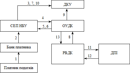 Платники податків сплачують платежі до бюджету через установи банків, у яких вони обслуговуються. Банк платника перераховує грошові кошти через СЕП НБУ на рахунки, відкриті в обласному управлінні Державного казначейства України в розрізі районів та кодів бюджетної класифікації доходів.