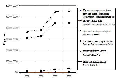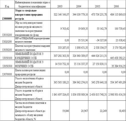 3.1 Динаміка показників обсягів екологічних зборів за використання природних ресурсів в Державний бюджет України за 2001 – 2007 роки та місцеві бюджети у Дніпропетровській області за 2003 – 2006 роки
