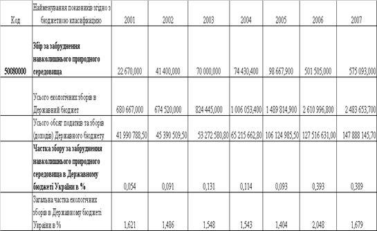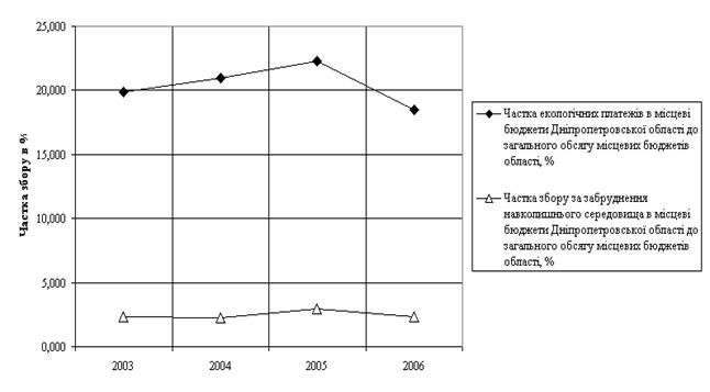 3.2 Динаміка показників обсягів екологічних зборів за забруднення навколишнього природного середовища в Державний бюджет України за 2001 –2007 роки та місцеві бюджети по Дніпропетровській області України за 2003 –2006 роки