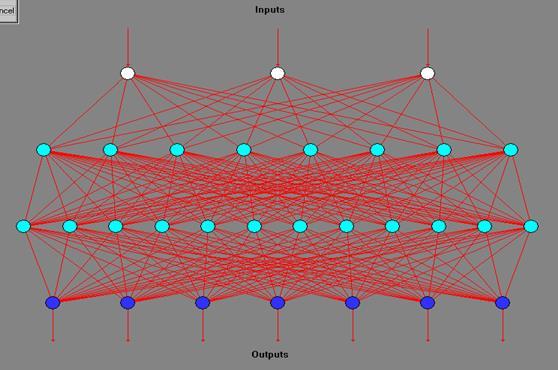 ), во входном слое обратной НС 3 нейрона, в выходном – 7, а количество скрытых слоев – 2 (рисунок 8).