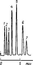 Рис. 3. Хроматограмма моносахаридов, полученная на колонке размером 250x4,6 мм с полигосилом 60 NH2 (5 мкм), подвижная фаза —ацетонитрил — вода (75:25 по объему), расход 2 мл/мин, детектор — УФ (190 нм): 1 — рамноза; 2 — ксилоза; 3 — арабиноза; 4 — фруктоза; 5 — манноза; 6 — глюкоза; 7 — галактоза