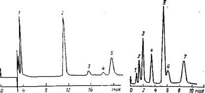 Рис. 7. Хроматограмма смеси ароматических углеводородов, полученная на колонке размером 250х4,6 мм с зорбаксом ОДС (6 мкм), подвижная фаза — метанол — вода (90:10 по объему), расход 1,5 мл/мин, детектор УФ (254 нм), проба 20 мкл: 1 — толуол; 2 — о