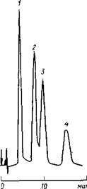 Рис. 1. Хроматограмма смеси аминных стабилизаторов полимеров, полученная на колонке размером 250x4,1 мм с силасорбом-600 (5 мкм), подвижная фаза — гексан — метиленхлорид — изопропанол — диэтил-амин (100:10:1:0,01 по объему), расход 1 мл/мин, детектор — УФ (254 нм), проба 2 мкл: 1 — фенил-β-нафтиламин; 2 — N-фенил-N’-изопропил-n-фенилендиамин; 3 — N-1,3-диметилбутил-N’-фенил-n-фенилендиамин; 4 — N,N'-бис(1,4-диметиламил-n-фенилендиамин)