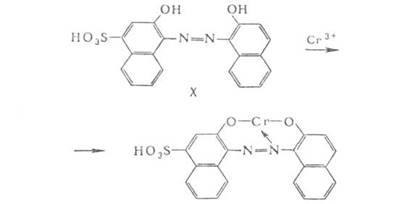 внутрикомплексные соединения; пример - хромовый сине-черный (X). В некоторых хромовых А. группы ОН и СООН содержатся в одном ароматическом ядре в орто-положении друг к другу. При крашении хромовыми азокрасители белковых волокон атом Сr связывает в комплекс молекулы азокрасителя и белка (например, кератина шерсти) по его функциональным группам (СООН, ОН, NH2